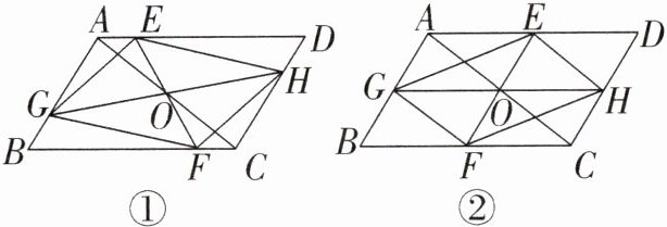 10. (哈尔滨中考)如图①,□ABCD中,点O是对角线AC的中点,EF过点O,与AD,BC分别相交于点E,F,GH过点O,与AB,CD分别相交于点G,H,连接EG,FG,FH,EH。