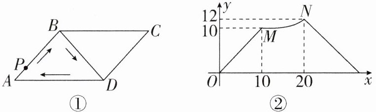 4. (2025·白银模拟)如图①,四边形$ABCD$是平行四边形,连接$BD$,动点$P$从点$A$出发,沿折线$AB \to BD \to DA$匀速运动,回到点$A$后停止.设点$P$运动的路程为$x$,线段$AP$的长为$y$,图②是$y$与$x$的函数关系的大致图象,则四边形$ABCD$的面积是(