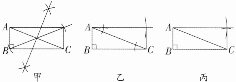 7. 综合实践课上,老师让同学们利用尺规借助直角三角形 $ABC$ 作矩形,如图是甲、乙、丙三名同学作的矩形,其中正确的是(