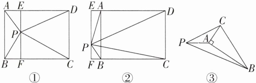 【类比探究】(2)如图②,点 $P$ 是矩形 $ABCD$ 外一点,过点 $P$ 作 $EF ⊥ AD$,分别交 $AD$,$BC$ 反向延长线于点 $E$,$F$,②中结论还成立吗?若成立,请说明理由。