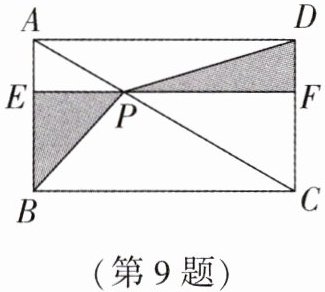 9. (2025·泰州月考)如图,$P$ 是矩形 $ABCD$ 的对角线 $AC$ 上一点,过点 $P$ 作 $EF // BC$,分别交 $AB$,$CD$ 于点 $E$,$F$,连接 $PB$,$PD$。若 $AE = 2$,$PF = 8$,则图中阴影部分的面积为