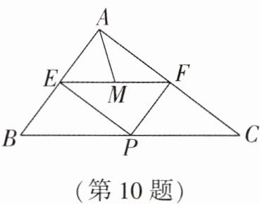 10. (2025·绵阳期中)如图,在 $△ ABC$ 中,$AB = 6$,$AC = 8$,$BC = 10$,$P$ 为边 $BC$ 上一动点(且点 $P$ 不与点 $B$,$C$ 重合),$PE ⊥ AB$ 于点 $E$,$PF ⊥ AC$ 于点 $F$,$M$ 为 $EF$ 的中点。设 $AM$ 的长为 $x$,则 $x$ 的取值范围是