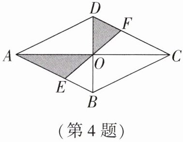 4. (2025·福建中考改编)如图,菱形 $ABCD$ 的对角线相交于点 $O$,$EF$ 过点 $O$ 且与边 $AB$,$CD$ 分别相交于点 $E$,$F$。若 $AC = 4$,$BD = 2$,则 $△ AOE$ 与 $△ DOF$ 的面积之和为