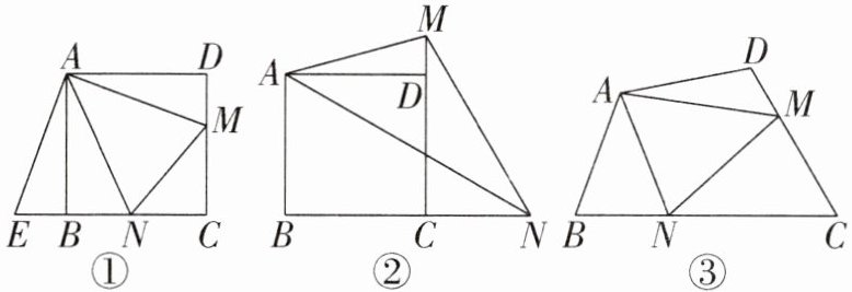 (1)【初步尝试】如图①,将 $ △ ADM $ 绕点 $ A $ 顺时针旋转 $ 90° $,点 $ D $ 与点 $ B $ 重合,得到 $ △ ABE $,连接 $ MN $。用等式写出线段 $ DM $,$ BN $,$ MN $ 的数量关系