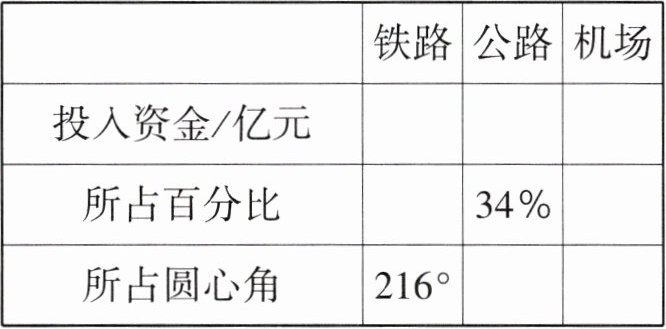 (2)由条形统计图可得6个机场投入的建设资金总额为8+5+2+4+4+7=30(亿元),由统计表可得铁路投入资金占比为$\frac{216}{360°}$×100%=60%,