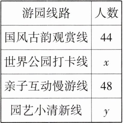 10. (2024·成都中考改编)2024年成都世界园艺博览会以“公园城市 美好人居”为主题,秉持“绿色低碳、节约持续、共享包容”的理念,以园艺为媒介,向世界人民传递绿色发展理念和诗意栖居的美好生活场景。在主会场有多条游园线路,某单位准备组织全体员工前往参观,每位员工从其中四条线路(国风古韵观赏线、世界公园打卡线、亲子互动慢游线、园艺小清新线)中选择一条。现随机选取部分员工进行了“线路选择意愿”的摸底调查,并根据调查结果绘制成如下统计图表。