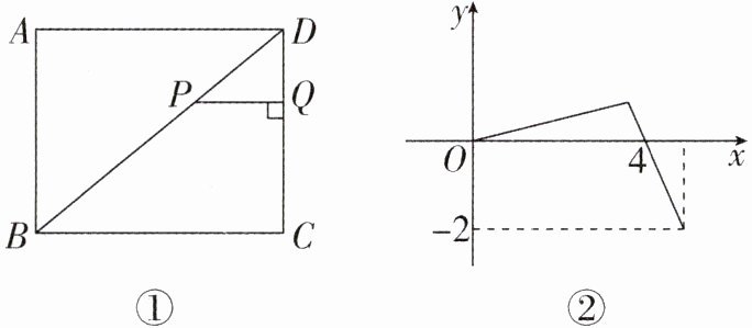 2. (2024·临夏中考)如图①,矩形 $ABCD$ 中,$BD$ 为其对角线,一动点 $P$ 从 $D$ 出发,沿着 $D→B→C$ 的路径行进,过点 $P$ 作 $PQ⊥CD$,垂足为 $Q$.设点 $P$ 的运动路程为 $x$,$PQ - DQ$ 为 $y$,$y$ 与 $x$ 的函数图象如图②,则 $AD$ 的长为