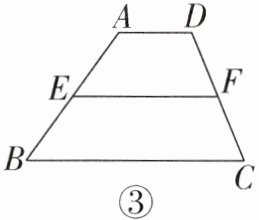 【数学发现】(2)如图③,在梯形 $ABCD$ 中,$AD // BC$,$E$,$F$ 分别是两腰 $AB$,$DC$ 的中点,我们把 $EF$ 叫作梯形 $ABCD$ 的中位线. 请类比三角形的中位线的性质,猜想 $EF$ 和 $AD$,$BC$ 有怎样的位置和数量关系?