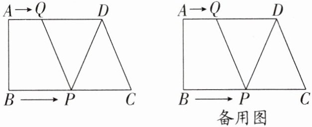 3. 如图,在直角梯形 $ABCD$ 中,$AD // BC$,$∠ B = 90^{\circ}$,且 $AD = 12\ \mathrm{cm}$,$AB = 8\ \mathrm{cm}$,$DC = 10\ \mathrm{cm}$,若动点 $P$ 从点 $A$ 出发,以每秒 $2\ \mathrm{cm}$ 的速度沿线段 $AD$ 向点 $D$ 运动;动点 $Q$ 从 $C$ 点出发以每秒 $3\ \mathrm{cm}$ 的速度沿 $CB$ 向点 $B$ 运动,当点 $P$ 到达点 $D$ 时,动点 $P$,$Q$ 同时停止运动,设点 $P$,$Q$ 同时出发,并运动了 $t$ 秒,回答下列问题: