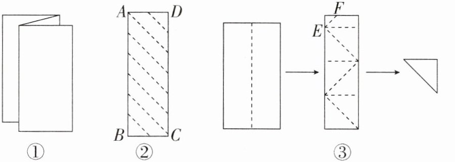 @@(3)①使得剩余部分能够插入到折叠图形的夹层中(描述合理即可) 解析:由题意可得,在第二步骤中,由下往上沿折痕折叠,故上方的矩形为剩余部分,但其不能直接插入原本折叠形成的等腰直角三角形中,需先沿折痕$EF$将角折叠,之后再插入原本的折叠图形中。②16 解析:在第二步骤中,由折叠过程可知最多有$8$个面折叠在一起,而由第一步骤可得这$8$个面均为双层,故收纳完成后其层数最多部分有$16$层。