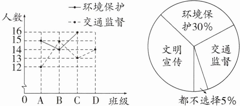 答案:7. (1)97.2° 解析:由折线统计图可得选择交通监督的各班学生总数为12 + 15 + 13 + 14 = 54(人),在四个班总人数中所占百分比为54÷200×100% = 27%,扇形统计图中交通监督所在扇形的圆心角度数 = 360°×27% = 97.2°.