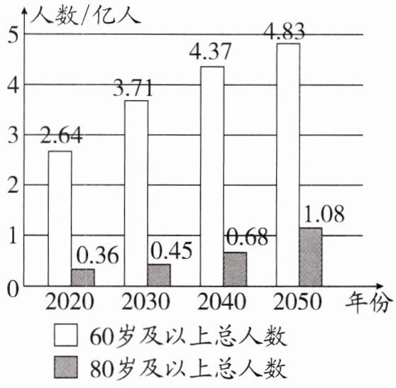 答案:6. C 解析:A.预计2050年我国60岁及以上老年人数量将达到4.83亿人,故选项正确,不符合题意;B.预计2020 - 2030年我国60岁及以上老年人数量增长最多,故选项正确,不符合题意;C.预计2050年我国80岁及以上老年人数量占全国60岁及以上总人数的$\frac{1.08}{4.83}$<$\frac{1}{3}$,故选项不正确,符合题意;D.预计2040 - 2050年我国80岁及以上老年人数量增长最多,故选项正确,不符合题意.故选C.