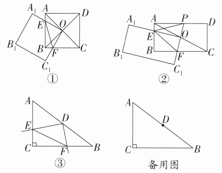 数学实践课上,活动小组的同学将两个正方形纸片按照图①所示的方式放置。如图①,正方形 $ABCD$ 的对角线相交于点 $O$,点 $O$ 又是正方形 $A_{1}B_{1}C_{1}O$ 的一个顶点,且这两个正方形的边长相等,四边形 $OEBF$ 为这两个正方形的重叠部分,正方形 $A_{1}B_{1}C_{1}O$ 可绕点 $O$ 旋转。