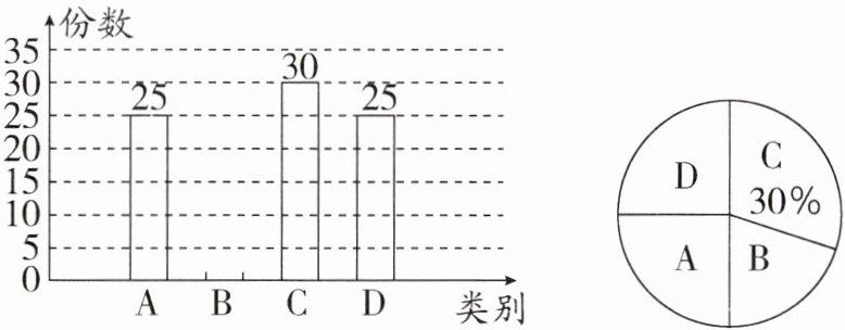 答案:11. 72 解析:优质特色作业共有 $ 30 ÷ 30\% = 100 $(份),B类作业有 $ 100 - 25 - 30 - 25 = 20 $(份),