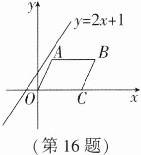 答案:16. 6 解析:连接 $ AC $,$ BO $ 交于点 $ D $,如图,当直线 $ y = 2x + 1 $ 向下平移经过 $ D $ 点时,与 $ y $ 轴的交点为 $ E $,直线 $ DE $ 可将 $ □ OABC $ 的面积平分。