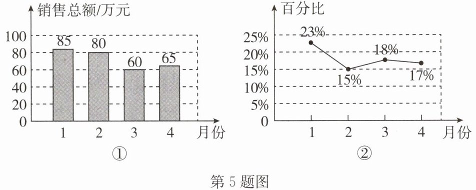 5. (2025·常熟期中)某手机店1~4月份的手机销售总额如图①,其中一款音乐手机的销售额占当月手机销售总额的百分比如图②. 下列结论正确的是(