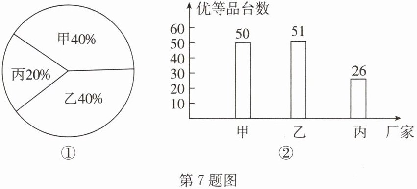 7. 某商店按图①给出的比例,从甲、乙、丙三个厂家共购回饮水机150台,商店质检员对购进的这批饮水机进行检测,并绘制了如图所示的统计图②. 请根据图中提供的信息解答下列问题: