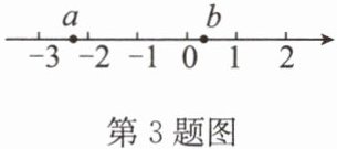 解:由数轴可知,$a$在$-3$和$-2$之间,$b$在$0$和$1$之间,所以$a < b$,即$a - b < 0$。