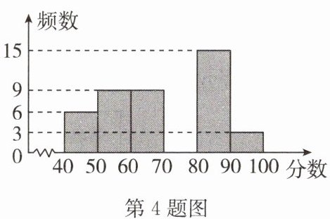 4. (2024·盐城二模)从全校学生中采用简单随机抽样的方法抽取了60名学生的成绩进行分析,绘制了如图所示的频数分布直方图(每一组含前一个边界值,不含后一个边界值),其中70~80分数段的条形还未画出.如果60分及以上为及格,那么估计全校成绩及格的百分率为