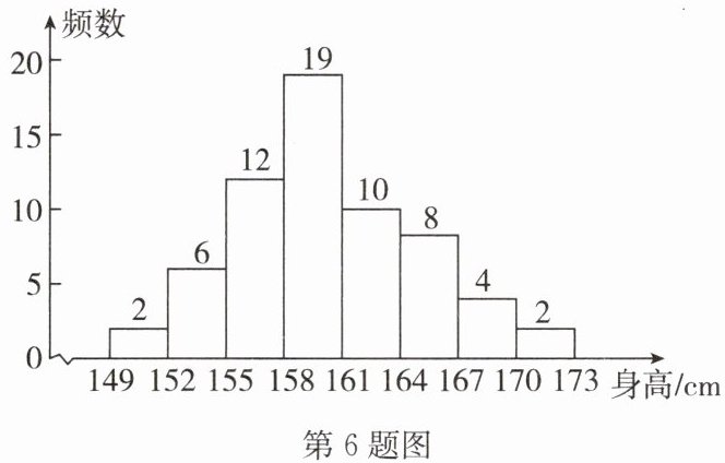 6. 为了参加全校广播体操比赛,七年级准备从63名同学中挑选身高相差不多的40名学生参加比赛,根据这63名学生身高x(cm)的频数分布直方图(如图所示,每组数据含最小值,不含最大值),可得参加比赛的学生身高x的合理范围是