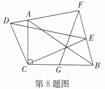8. (2024·建邺区期末)如图,在 $△ ABC$ 中,$∠ ACB = 90^{\circ}$,$AC = 2\ cm$,$BC = 3\ cm$.将 $△ ABC$ 绕点 $C$ 按逆时针方向旋转后得 $△ DEC$,直线 $DA$,$BE$ 相交于点 $F$.取 $BC$ 的中点 $G$,连接 $GF$,则 $GF$ 长的最大值为