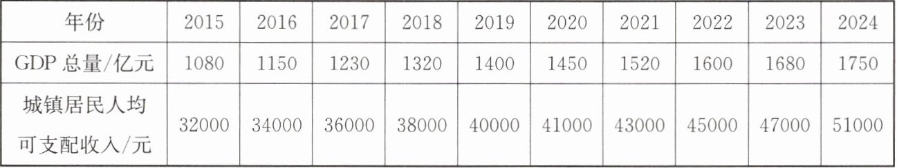 (2) 计算增长率:选择2015~2024年中任意连续两年,计算GDP和城镇居民人均可支配收入的年增长率[公式:增长率=(后一年数据-前一年数据)÷前一年数据×100%].