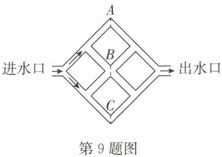 9. 如图,一粒杂质从粗细相同且水平放置的“田字型”水管的进水口流入,在 A,B,C 三处装有过滤网,该杂质经过