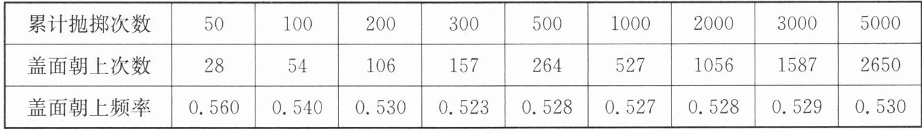 根据以上试验数据可以估计出“盖面朝上”的概率为