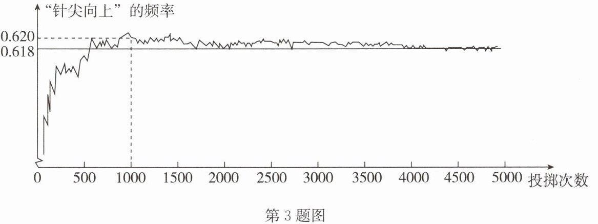 3. (2025·鼓楼区期中)如图是小华用计算机模拟随机投掷一枚图钉的实验结果,若再次抛掷一枚图钉,则可以估计“钉尖向上”的概率是