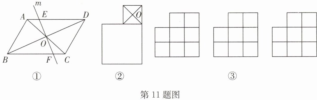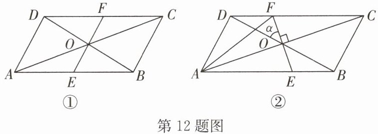 12. (2025·吉州区期末)如图 ①,$□ ABCD$ 的对角线 $AC$ 和 $BD$ 相交于点 $O$,$EF$ 过点 $O$ 且与边 $AB$,$CD$ 分别相交于点 $E$ 和点 $F$.