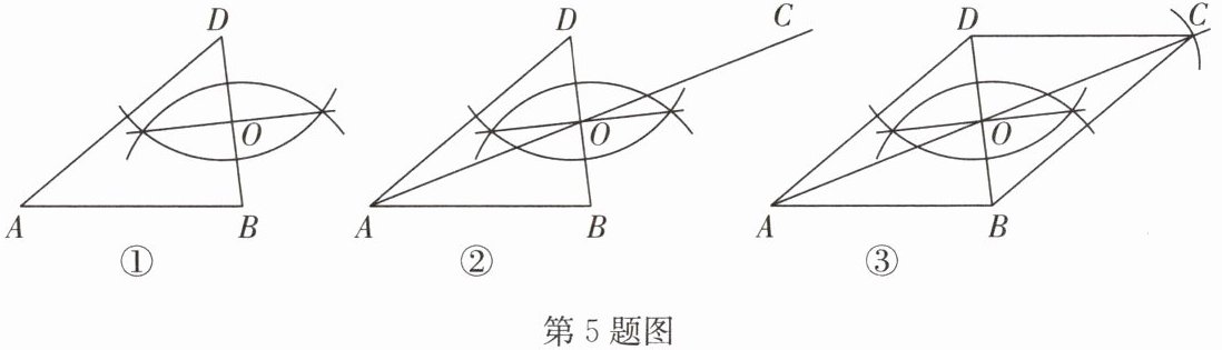5. (2025·中牟县模拟)综合实践课上,嘉嘉画出$△ ABD$,利用尺规作图找一点 $C$,使得四边形 $ABCD$ 为平行四边形.①~③是其作图过程.在嘉嘉的作法中,可直接判定四边形 $ABCD$ 为平行四边形的条件是 (