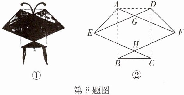8. (2024·温州)如图①是一款风筝,图②是其骨架示意图,$A$,$B$,$C$,$D$是矩形的四个顶点,点$E$,$F$在$AB$中垂直线上,$∠ EAB=∠ FDC=45^{\circ}$,$AF$,$DE$交于点$G$,$CE$,$BF$交于点$H$. 若$AB=10\mathrm{dm}$,$BC=7\mathrm{dm}$,则骨架总长(图②中所有实线之和)为