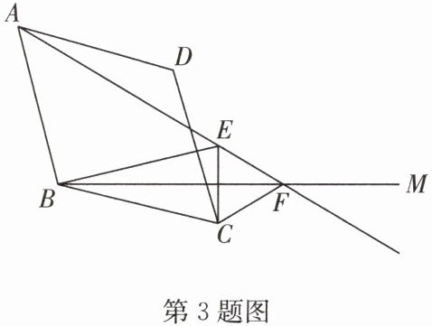 3. 如图,在菱形 $ ABCD $ 中,$ ∠ BAD = 60^{\circ} $,在 $ ∠ ABC $ 内作射线 $ BM $,作点 $ C $ 关于 $ BM $ 的对称点 $ E $,连接 $ AE $ 并延长交 $ BM $ 于点 $ F $,连接 $ CF $,$ CE $,$ BE $.