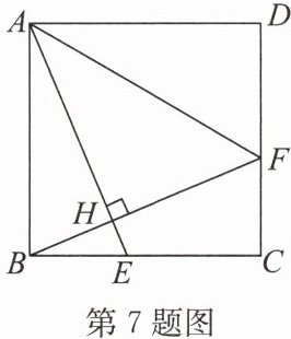 7. 如图,在正方形 $ABCD$ 中,$E$ 是 $BC$ 上的一点,连接 $AE$,过点 $B$ 作 $BH ⊥ AE$,垂足为 $H$,延长 $BH$ 交 $CD$ 于点 $F$,连接 $AF$。