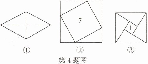 4. (2024·玄武区期中)把图①中的菱形沿对角线分成四个全等的直角三角形,将这四个直角三角形分别拼成如图②,图③所示的正方形,如果图②和图③每个图形中间的正方形面积分别为 7 和 1,则图①中菱形的面积为