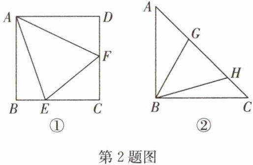 2. (1) 如图①,在正方形 $ABCD$ 中,$E$,$F$ 分别是 $BC$,$CD$ 上的点,且 $∠ EAF = 45^{\circ}$,探究图中线段 $BE$,$EF$,$FD$ 之间的数量关系,并说明理由;