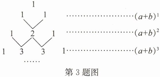 3. 我国古代数学的许多发现都曾位居世界前列,其中“杨辉三角”就是一例.如图,这个三角形的构造法则是两腰上的数都是$1$,其余每个数均为其上方左右两数之和,它给出了$(a+b)^{n}$($n$为正整数)的展开式(按$a$的次数由大到小的顺序排列)的系数规律.例如,在三角形中,第三行的三个数$1,2,1$恰好对应$(a+b)^{2}=a^{2}+2ab+b^{2}$展开式中的系数;第四行的四个数$1,3,3,1$恰好对应$(a+b)^{3}=a^{3}+3a^{2}b+3ab^{2}+b^{3}$展开式中的系数.