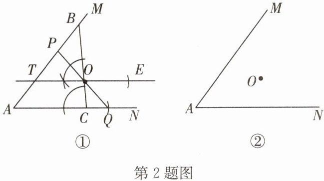 小亮的作法如下:如图①,过点O作直线BC分别交AM,AN于点B,C. 作∠BOT=∠BCA,且OT交AM于点T,在射线TO上截取OE=OT,在AN上截取AQ,使得AQ=TE,连接QO,并延长交AM于点P,线段PQ即为所求.