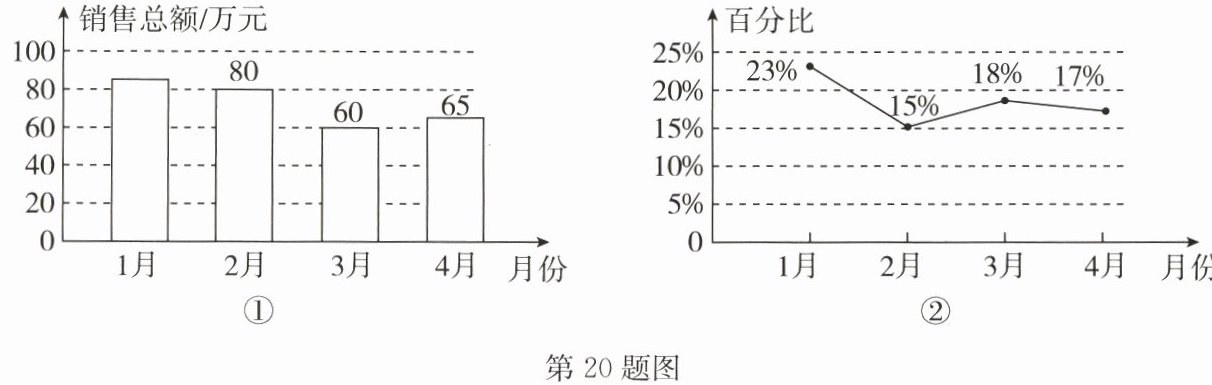 20.(14分)(2024·靖江月考)某网店2024年1~4月份的电子产品销售总额如图①,其中某一款平板电脑的销售额占当月电子产品销售总额的百分比如图②. 已知该网店1~4月份所有商品销售总额为290万元,根据图表信息解答下列问题: