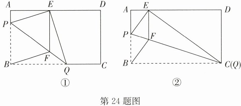 24. (12 分)如图①,在矩形纸片 $ABCD$ 中,$AB = 3\ \mathrm{cm}$,$AD = 5\ \mathrm{cm}$,折叠纸片使点 $B$ 落在边 $AD$ 上的点 $E$ 处,折痕为 $PQ$,过点 $E$ 作 $EF// AB$,交 $PQ$ 于点 $F$,连接 $BF$.