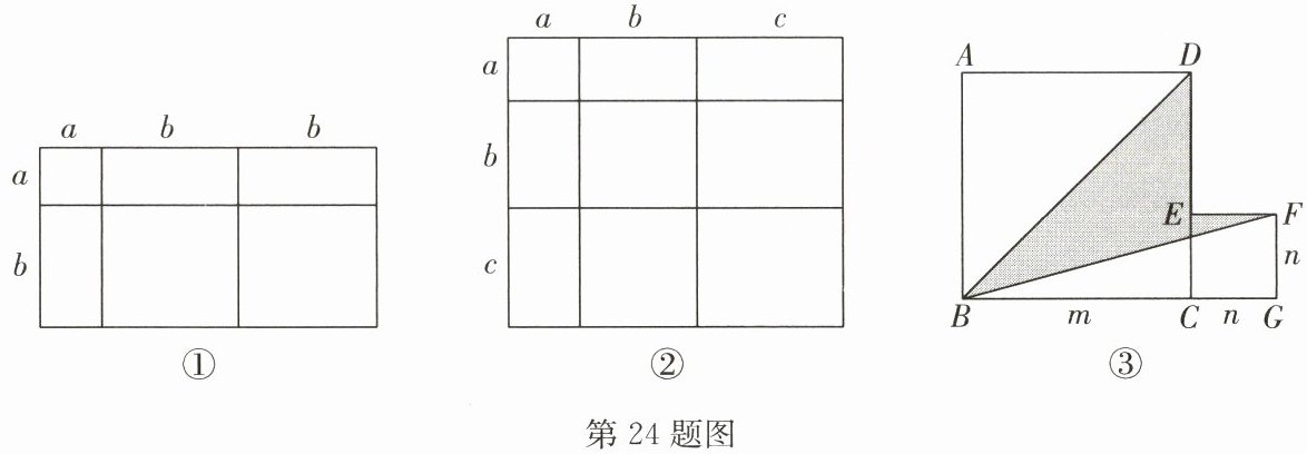 (3)如图③,将两个边长分别为$m$,$n$的正方形拼在一起,$B$,$C$,$G$三点在同一直线上,连接$BD$和$BF$,若$m + n = 10$,$mn = 20$。请求出阴影部分的面积。
