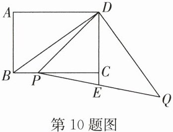 10. 如图,在矩形 $ ABCD $ 中,$ AB = 5 $,$ AD = 7 $,连接 $ BD $,把线段 $ BD $ 绕点 $ D $ 逆时针旋转 $ 90^{\circ} $ 得到线段 $ QD $. 在 $ BC $ 边上取点 $ P $,使 $ BP = 2 $,连接 $ PQ $ 交 $ DC $ 的延长线于点 $ E $,则线段 $ DE $ 的长为