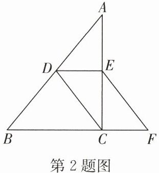 2. 如图,在 $ \mathrm{Rt} △ ABC $ 中,$ ∠ ACB = 90^{\circ} $, $ D $, $ E $ 分别是 $ AB $, $ AC $ 的中点,连接 $ CD $,过点 $ E $ 作 $ EF // DC $ 交 $ BC $ 的延长线于点 $ F $,若四边形 $ CDEF $ 的周长是 16, $ AC $ 的长为 8,则 $ △ ABC $ 的周长是(