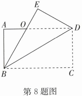 8. 如图,在矩形ABCD中,连接BD,将$△ BCD$沿对角线BD折叠得到$△ BED$,BE交AD于点O,BE恰好平分$∠ ABD$,若$AB=\sqrt{3}$,则点O到BD的距离为(