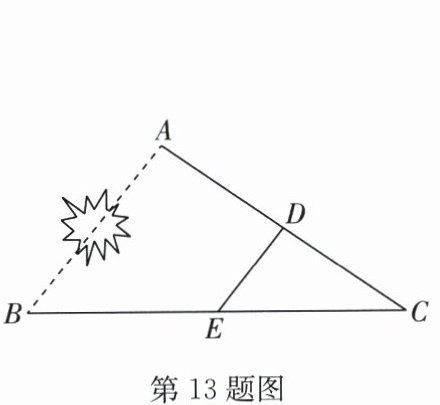 13. 如图,A,B两地被建筑物遮挡,为测量A,B两地的距离,在地面上选一点C,连接CA,CB,分别取CA,CB的中点D,E,若DE的长为36m,则A,B两地的距离为