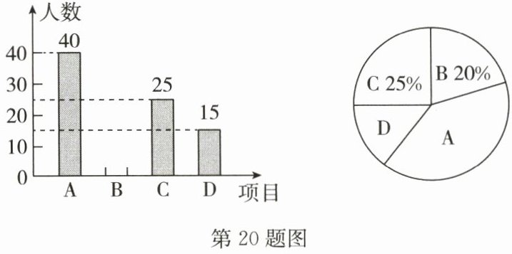 20. (8分)方寸之间,一览千年。博物馆不仅是展示一个国家和民族文化的重要窗口,更是进行国民教育、历史文化和艺术熏陶的重要课堂。为了让孩子们更好地触摸传统文脉,涵养文化自信。某中学八年级历史组开展了“与历史对话,与文化共鸣”的博物馆专题活动,共开展四个项目:A. 讲述博物馆馆藏文物的故事;B. 制作博物馆专题手抄报;C. 制作博物馆系列文创产品;D. 挑战知识问答游戏。要求学生每人只能参与一项。为了解学生参与情况,现随机抽取若干名学生进行调查,并将调查结果绘制成如图的两幅不完整的统计图。根据以上信息,解答下列问题: