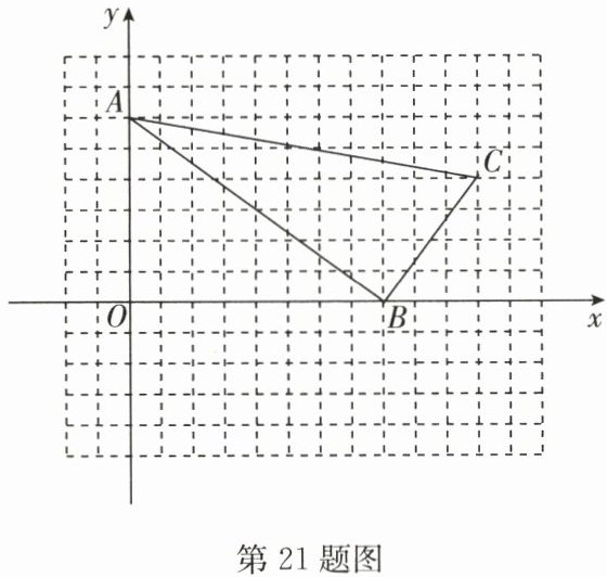 21. (8分)如图,在平面直角坐标系中,$△ ABC$三个顶点的坐标分别为$A(0,6)$,$B(8,0)$,$C(11,4)$(网格中每个小正方形的边长为1)。