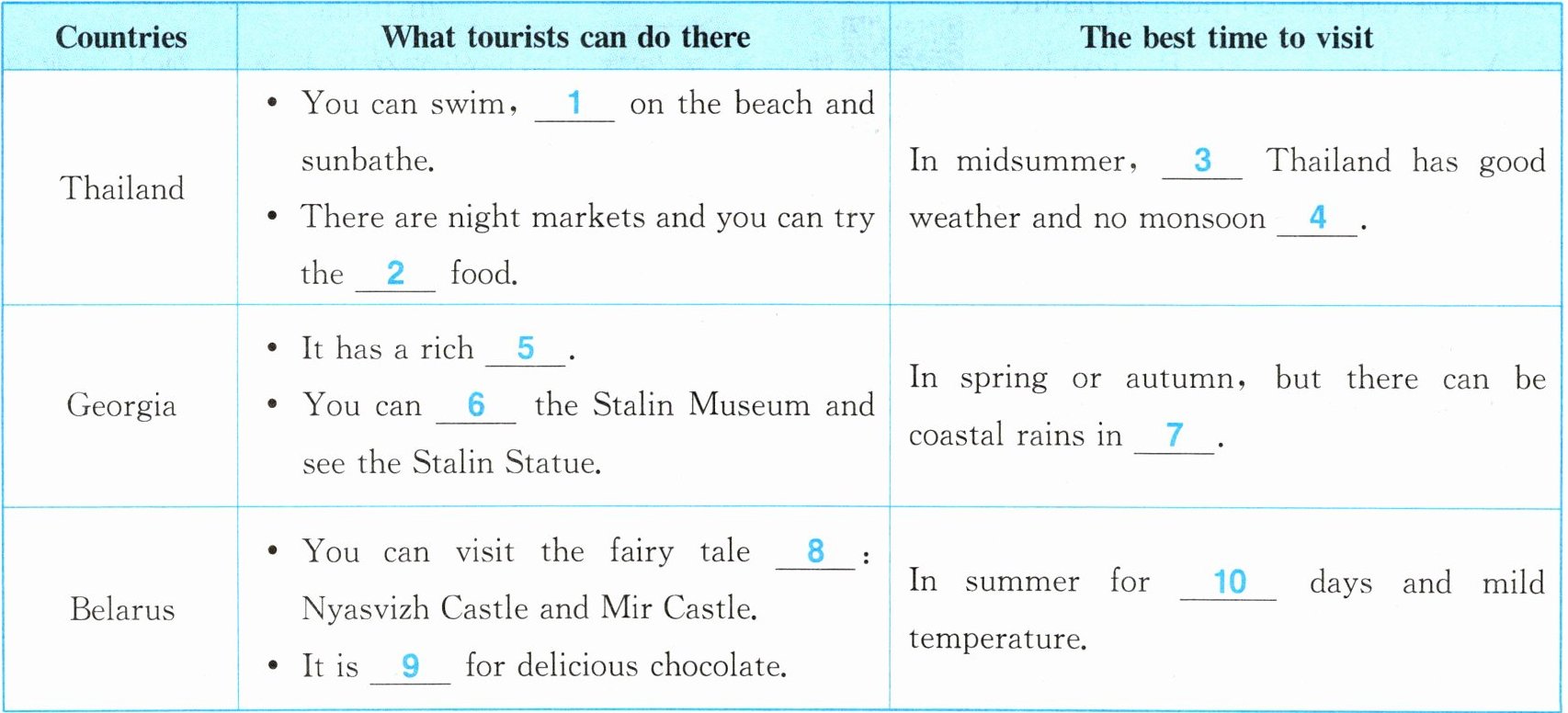 Here you can swim in the sea, lie on the beach and enjoy the sunshine. You can walk through busy night markets, taste the street food and learn about Thai culture. This country has three seasons—the cool season, the hot season and the rainy season. If you want to travel to Thailand in midsummer, between July and August, the best travel plan is to visit eastern Thailand. That's because the weather there is usually comfortable at that time and there are no monsoon (季风) rains in this area.