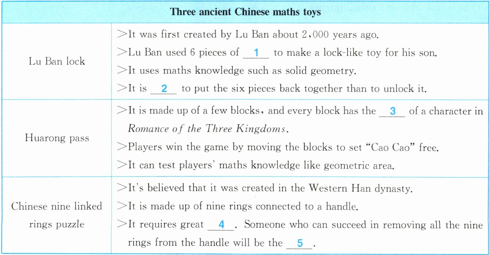 Lu Ban lock was first created by Chinese carpenter Lu Ban about 2,000 years ago. It is said that Lu used six wooden pieces to make a toy that looks like a lock for his son. The lock has a lot to do with solid geometry (立体几何). It's hard to separate the six pieces. However, it is usually easier to unlock a Lu Ban lock than to put it back together. Now, there are Lu Ban locks made up of nine or more pieces.