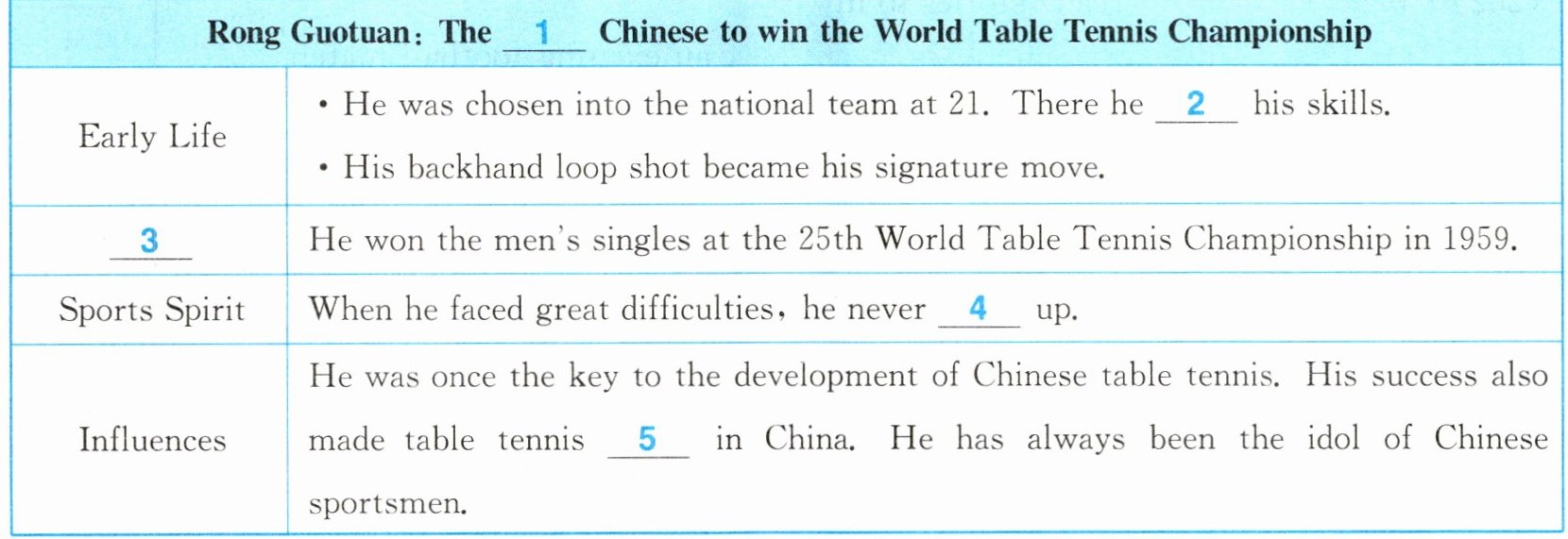 Rong's ways of training and practical skills have been passed down from the old ping-pong players to the young,leading China to lots of honours and glory in table tennis. His success also brought China popularity in table tennis. He has always been the idol(偶像)of Chinese sportsmen.